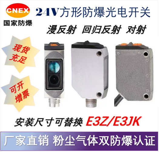S50方形防爆漫反射光电 24VDC | 漫反射 | 100mm 400mm 1000mm | NPN/PNP 常开/常闭 常开+常闭 | 10-30VDC | PVC线缆 | 不锈钢/铝合金 | 防爆等级 CT6 |
